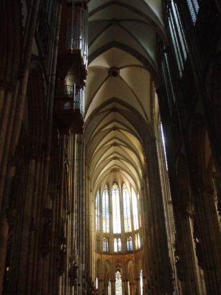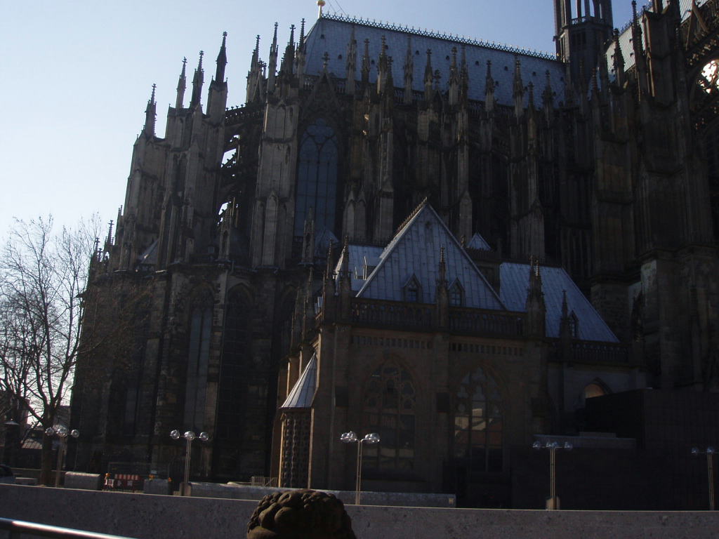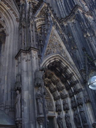 窓の外には飛行機雲がやけに多い。45度で上昇するいたずらっこの魔女がいるらしい。フランクフルトからCIEで2時間15分。ドイツの新幹線で往復した。設備もいいがチケットもなかなかいい値段。ライン川沿いの古城やぶどう畑、そしてローレライという名勝を車窓から楽しんでいるうちにケルン中央駅に到着。駅を出るとすぐ、目の前にケルン大聖堂が飛び込んできます。
