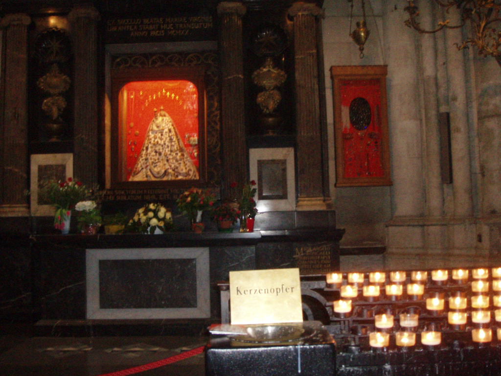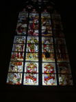 男の人は司祭のような人に注意をされて帽子をとっていた。ステンドグラス、太い柱の数、そして大きなパイプオルガンが・・・。南側にあるステンドグラスはルードヴィヒT世が奉納したもの。中世では、文字が読めない人々のために、聖書の中の物語を伝える役割を果たしたのがステンドグラスだと言われています。ステンドグラスの図柄をたどっていくと、一つ一つの物語を紐解いていくことができます。中央祭壇にある大聖堂の絵(1440年ごろ)は必見。
