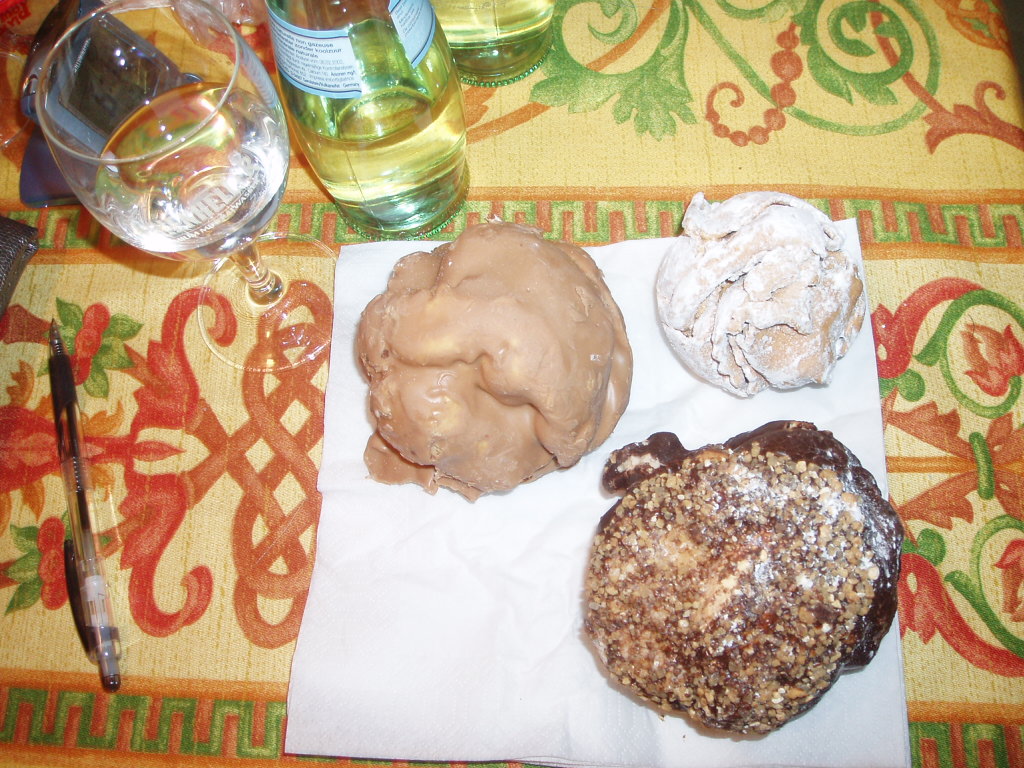 「シュネーバル」 雪のボールという意味のローテンブルクのお菓子があります。ショーウインドウには色別にきれいに並べられてありました。夕食(マミはホテルでお留守番。E・mamaはツァ・ヘルでワイン)